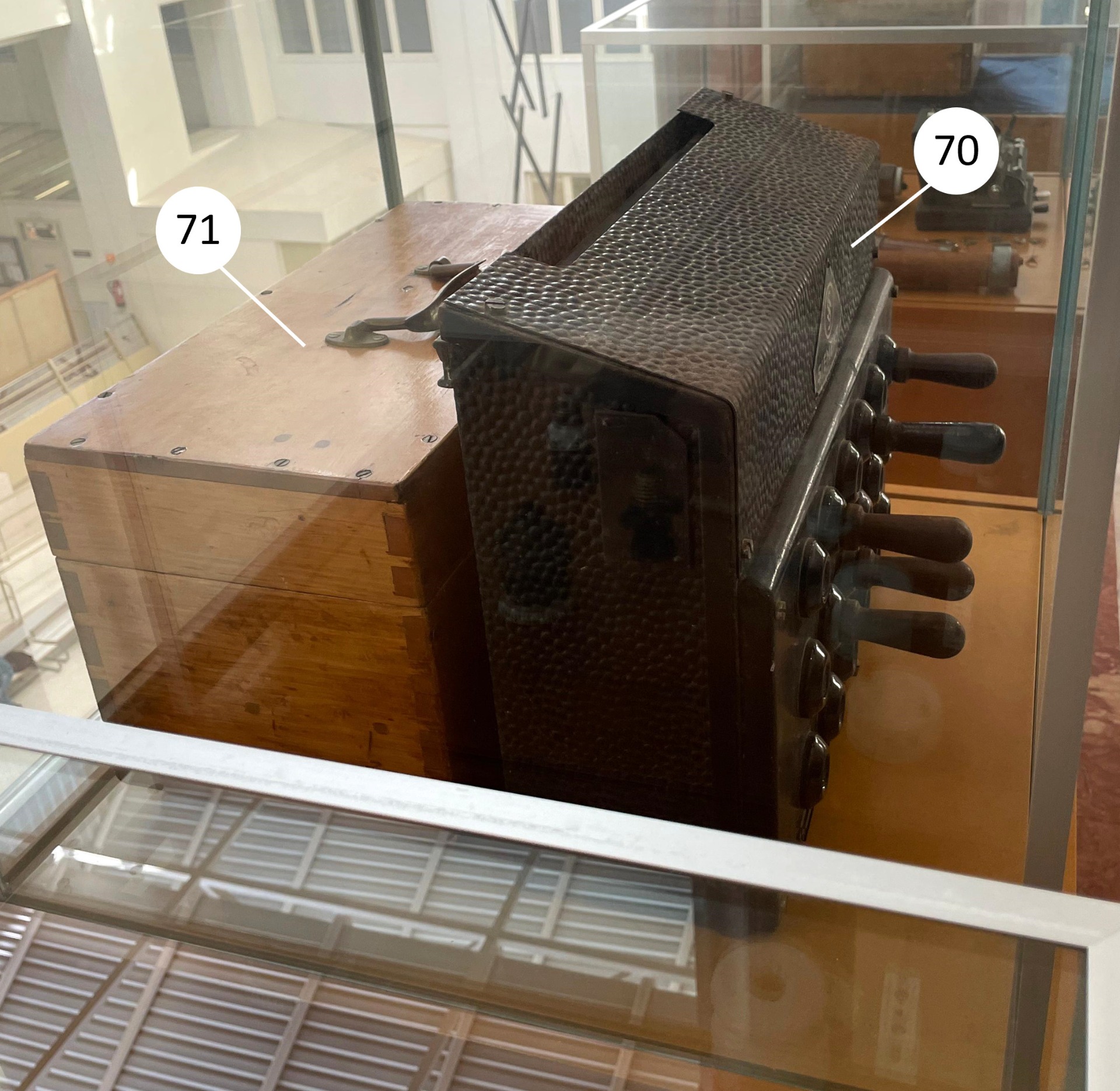 Lo más probable es que contenga un teléfono de campaña. Un teléfono de campaña era un teléfono portátil, diseñado para soportar condiciones extremas, como la guerra. Podían alimentarse con su propia batería (accionada mediante una manivela manual), desde una central telefónica o de una fuente de energía externa.