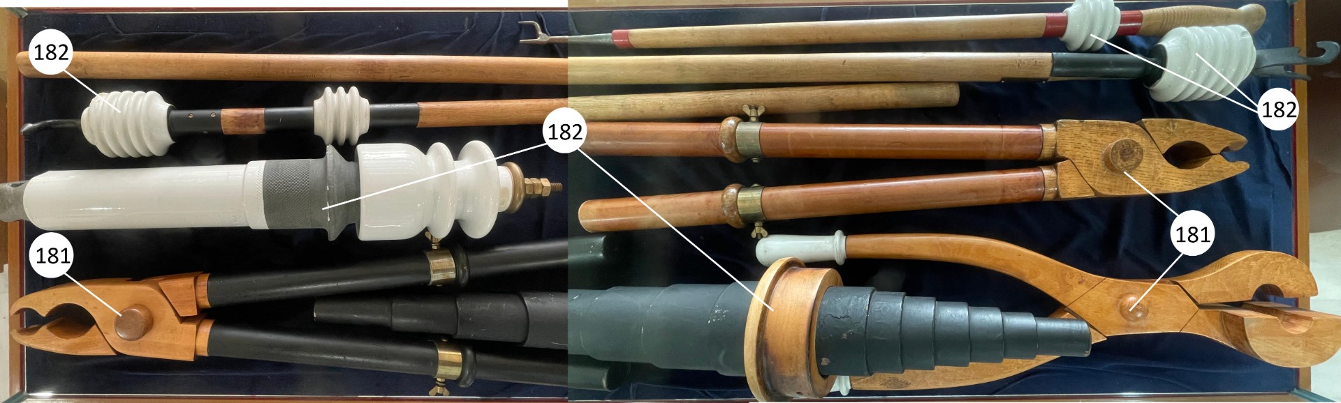 Las pértigas aislantes son instrumentos alargados con materiales aislantes como madera y porcelana, que permiten a los operarios manipular conductores de alta tensión con seguridad, por ejemplo, en torres eléctricas. En esta vitrina encontramos 3 pértigas.